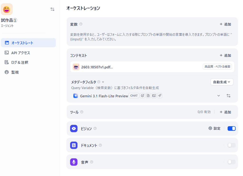 画面の下から2段目の欄、ビジョンと音声の間のところね。ここにファイル突っ込んでONにしたらナレッジとして機能するんかな・・後で調べてみようか。ちょっとだけバージョンアップしただけなのになんだかいろいろくっついとるぞ。