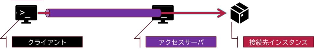 まず、最初にアクセスサーバという踏み台サーバにつなぎ、そこの経路をプロキシとして、最終接続先であるコンテナインスタンスに接続するという構図をとっている。接続プロトコルにはSSHを使用し、それ自体は特別な接続ではない。ただ、以下のポイントが重なったがゆえに、接続が少々めんどくさい。