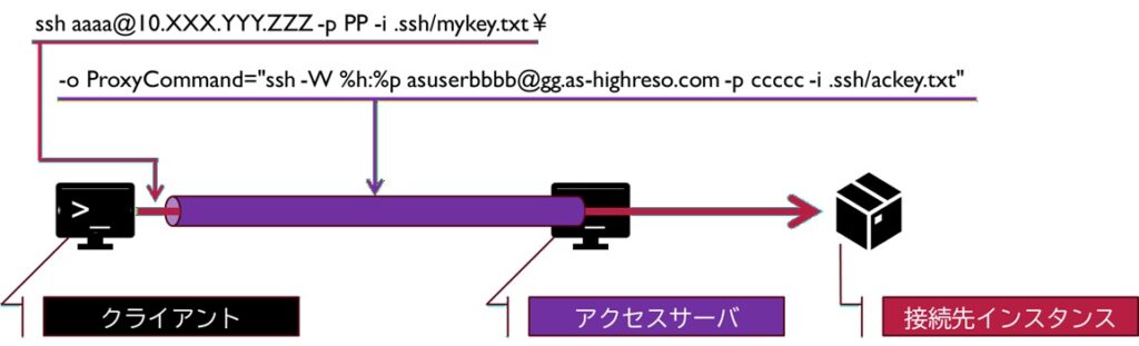 -o ProxyCommand="ssh -W %h:%p asuseraaaa@bb.as-highreso.com -p ccccc -i .ssh/ackey.txt"Windowsコンソールを開き、上記のコマンドを実行すると、ログインしてプロンプト表示を確認することができる。そのコマンドの対応関係は下図の通りである。