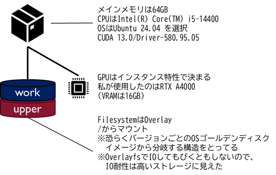 高速インスタンスとは、GPUを接続した状態のコンテナを払い出すサービスで、ちょっとしたIaaS-VMに似てる。違いがあるとすれば、この手のサービスはVMで払い出すことが多いのだが、このサービスではコンテナが払い出される点である。それゆえに、コンテナを使用するようなセルフホストサービスを構成することはできない。