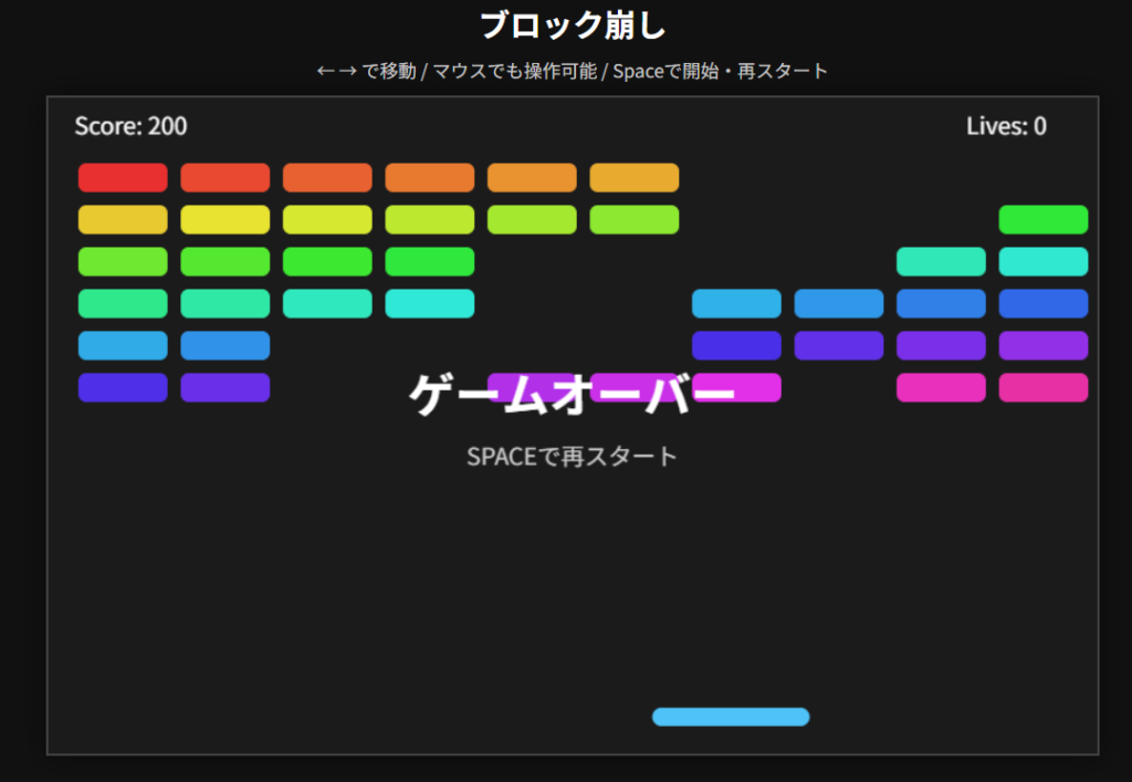 HTMLファイル作ってそこに困難貼り付けたら一応動くようです。ちょっと玉のスピードが速いのと、待ったなしでゲームが開始するのが玉に瑕ですけど。コメントのつけ方がどこかGeminiっぽい癖を持っていて、それはそれで面白いなと思いました。